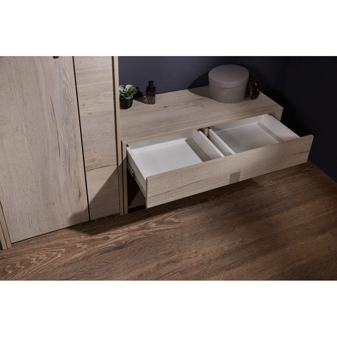 Прихожая «Мале» - обладательница лаконичного и свежего дизайна. Особое внимание привлекают тактильные ощущения от прикосновения к мебели. Декор и структуры, схожие с натуральным деревом по рисунку и шероховатости, придают глубину и естественность. Широкий спектр модулей позволит эргономично использовать Ваше пространство.