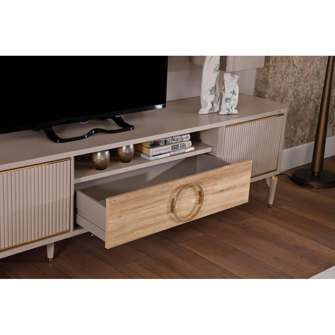 Стенка под ТВ Санвито SANV-15а - небольшая компактная стенка в стиле неоклассика, ар деко. Продолжая развивать коллекцию Санвито (SANVITO), турецкий бренд Беллона предлагает свои покупателям композицию SANV-15а из 3х модулей:Тумбы под ТВ SANV-15 +Часть мебельной стенки (панель+полка) SANV-15PP+Часть мебельной стенки (шкаф )SANV-15D.