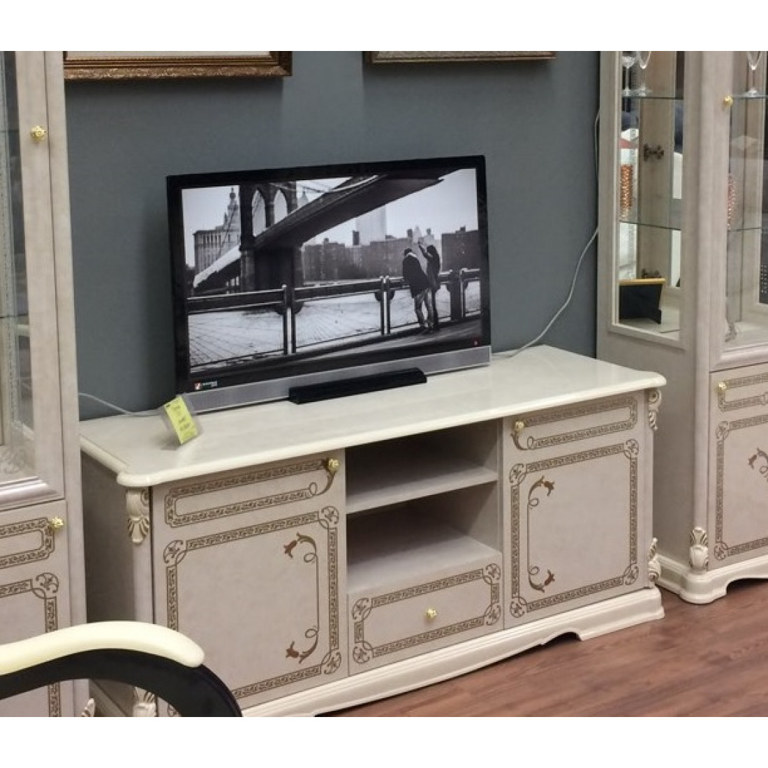 Тумба под телевизор Роза (беж) - выполнена в классическом стиле от Российской фабрики "ДИА мебель". Выполнена в бежевом цвете с элементами позолоты на фасаде. Аккуратные и элегантные ручки придадут атмосферу богатства. Такая тумба не займет много места и будет просто незаменимым модулем для вашей гостиной.